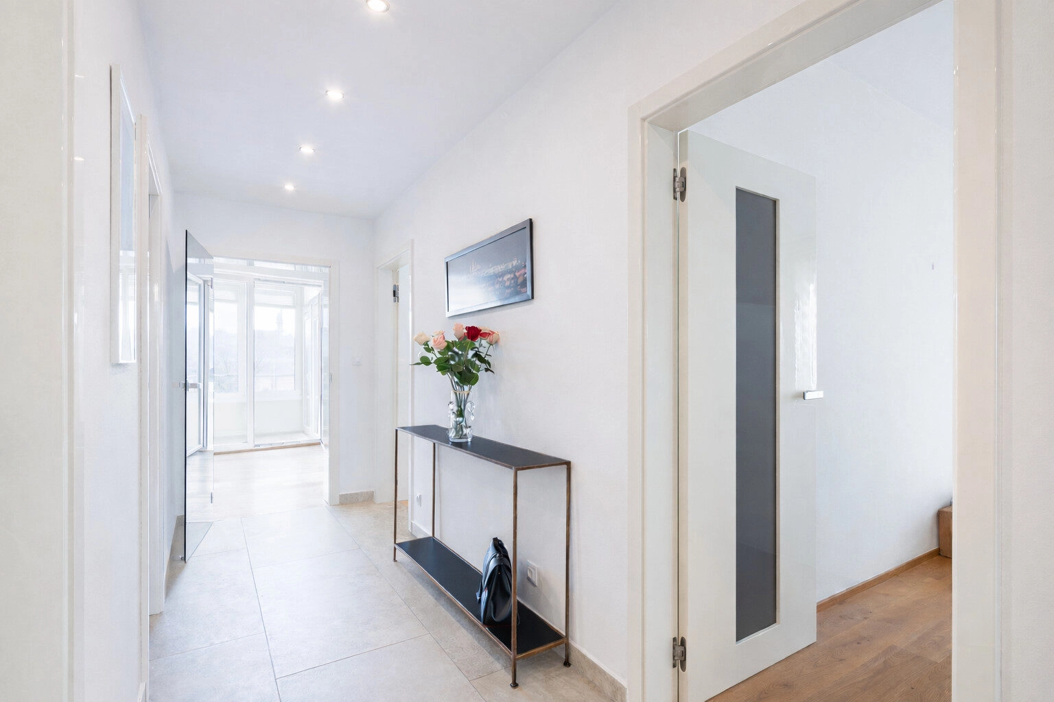 Obývací pokoj je propojený s kuchyňským koutem, ze kterého je vstup do celoročně využitelné zimní zahrady a dále na balkon. Byt dále nabízí dvě samostatné ložnice s výhledem do zmiňovaného vnitrobloku, koupelnu s vanou, separátní toaletu, dále chodbu ze které je vstup do všech místností, předsíň s vestavěnými skříněmi a praktickou komoru s pračkou a sušičkou značky Miele.