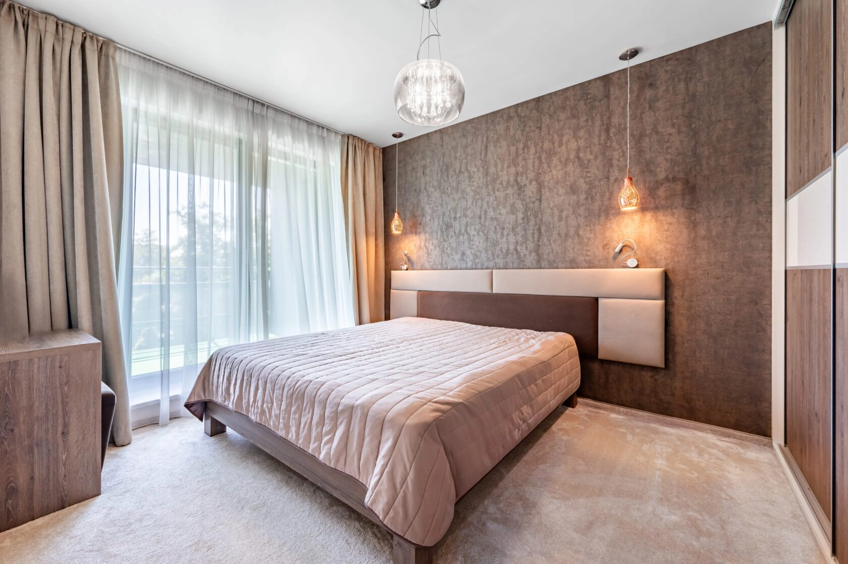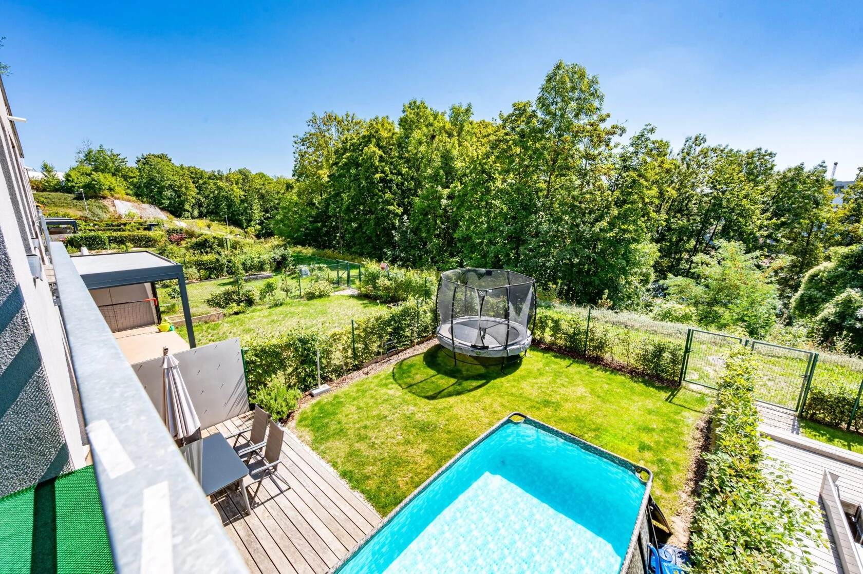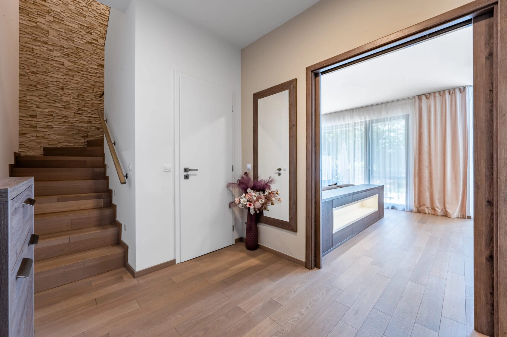 Standard a vybavení: dřevěné podlahy, dlažba, koberce v horním patře, elektrické žaluzie a rolety, sítě proti hmyzu, centrální vytápění, podlahové topení ve spodní části, pračka, sušička, parní trouba, indukční varná deska, myčka, sklep. V ceně nájmu je garážové stání.