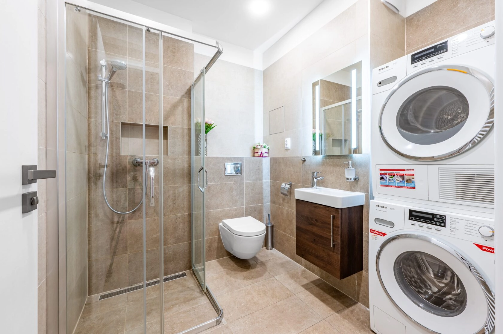 - Spodní úroveň: prostorný obývací pokoj s plně vybavenou kuchyní Bosch a vstupem na terasu a zahradu, koupelna se sprchovým koutem a WC, úložná komora, vstupní hala s vestavěnou skříní.